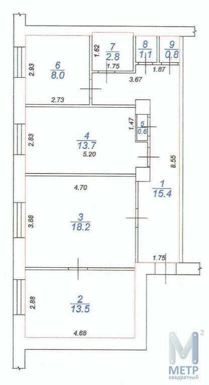 комнаты три, изолированные: 18,2 + 13,5 + 13,7 м2