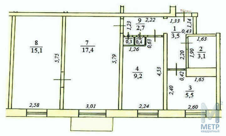 - смежно-изолированная планировка с комнатами: 17,4 + 15,1 + 9,2 м2 дает свободу для обустройства